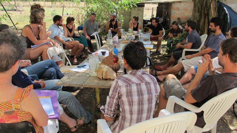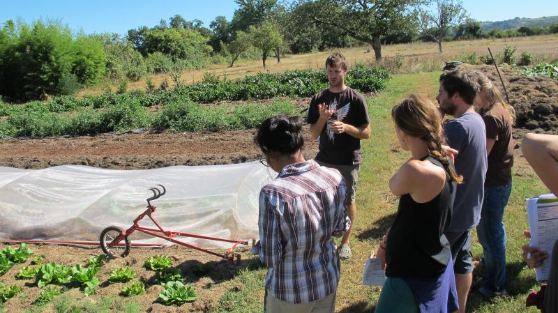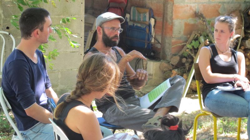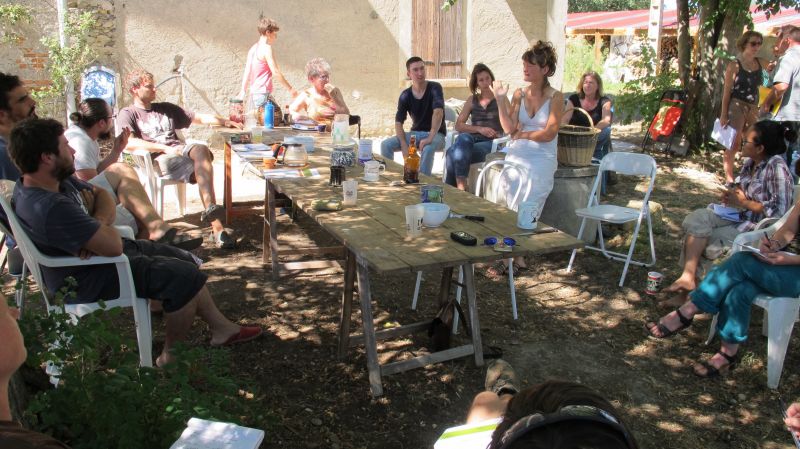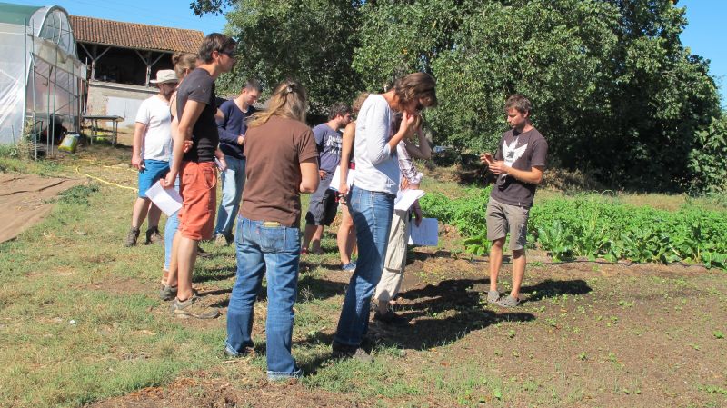 Les 20 participants (porteurs de projets, étudiant, jeunes paysans) se sont retrouvés sur les parcelles d'Alban Réveillé, maraîcher au sein de l'habitat participatif "L'An 01". Autour d'une présentation de ses techniques et de sa démarche paysanne, chacun a pu questionner et positionner son propre projet agricole. Les discussions en petits groupes ou autour des intervenants venus partager leur parcours d'installation, parcours de vie, ont ensuite permis de soulever différents enjeux, obstacles, méthodes... afin de réussir, entreprendre et orienter les projets.